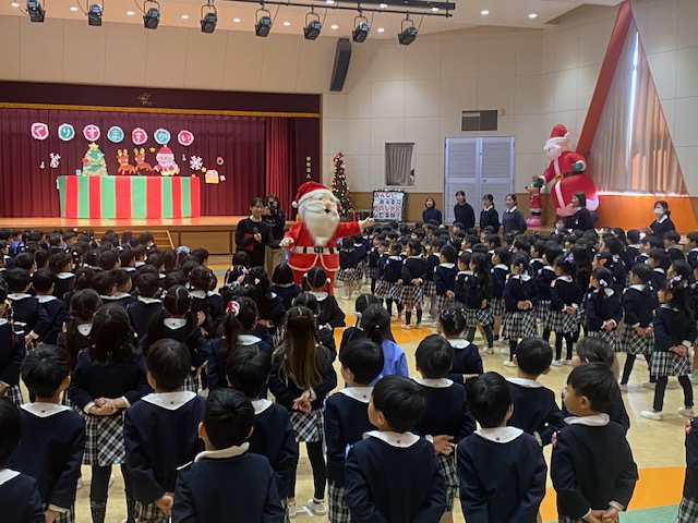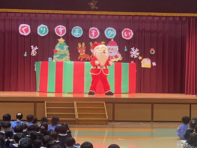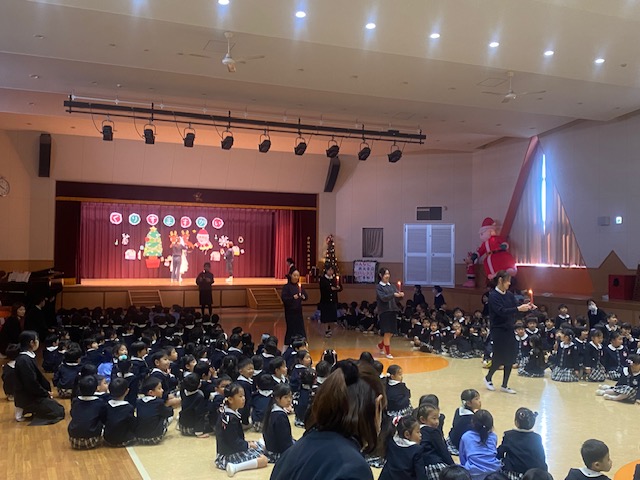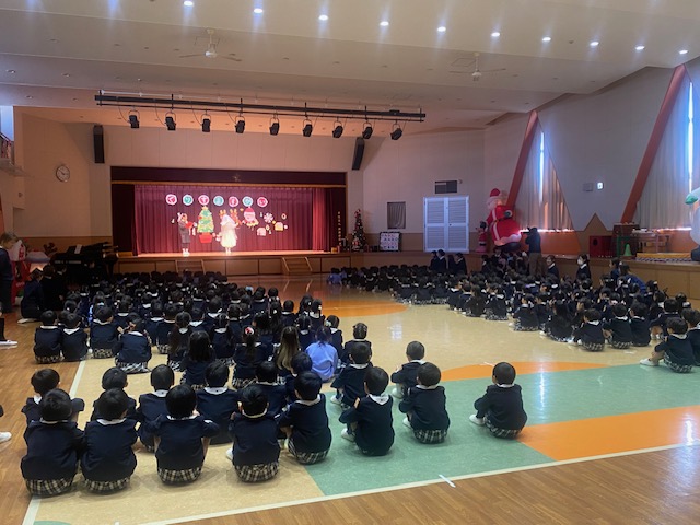 幼稚園のホールに全園児が集まり、クリスマス会を行いました。